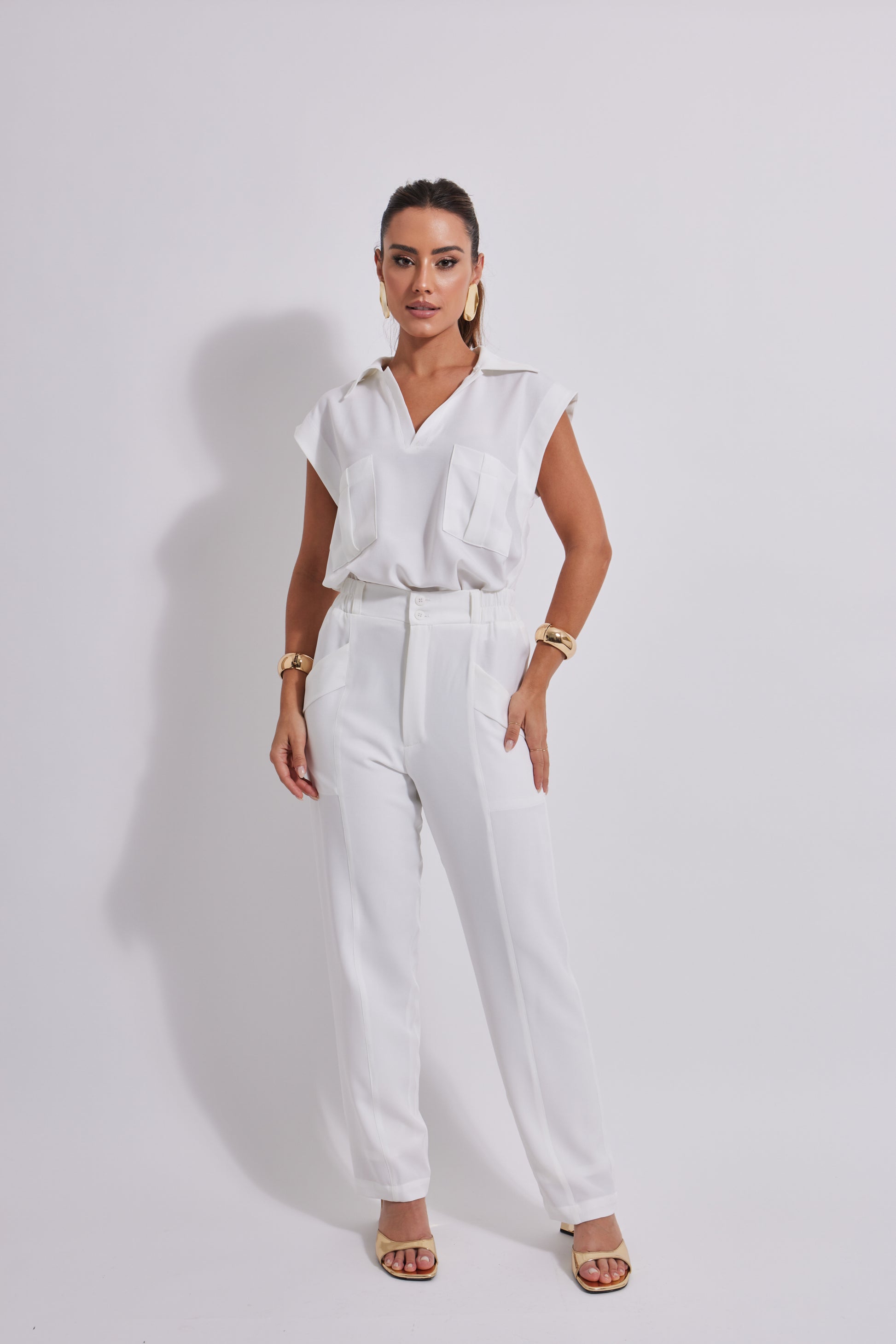 CALÇA DE MODELAGEM MAIS SECA, PERNAS AFUNILADAS, CÓS INTERMEDIÁRIO COM ELÁSTICOE E FECHAMENTO POR BOTÕES E ZÍPER. POSSUÍ BOLSOS NA FRENTE E COSTAS.