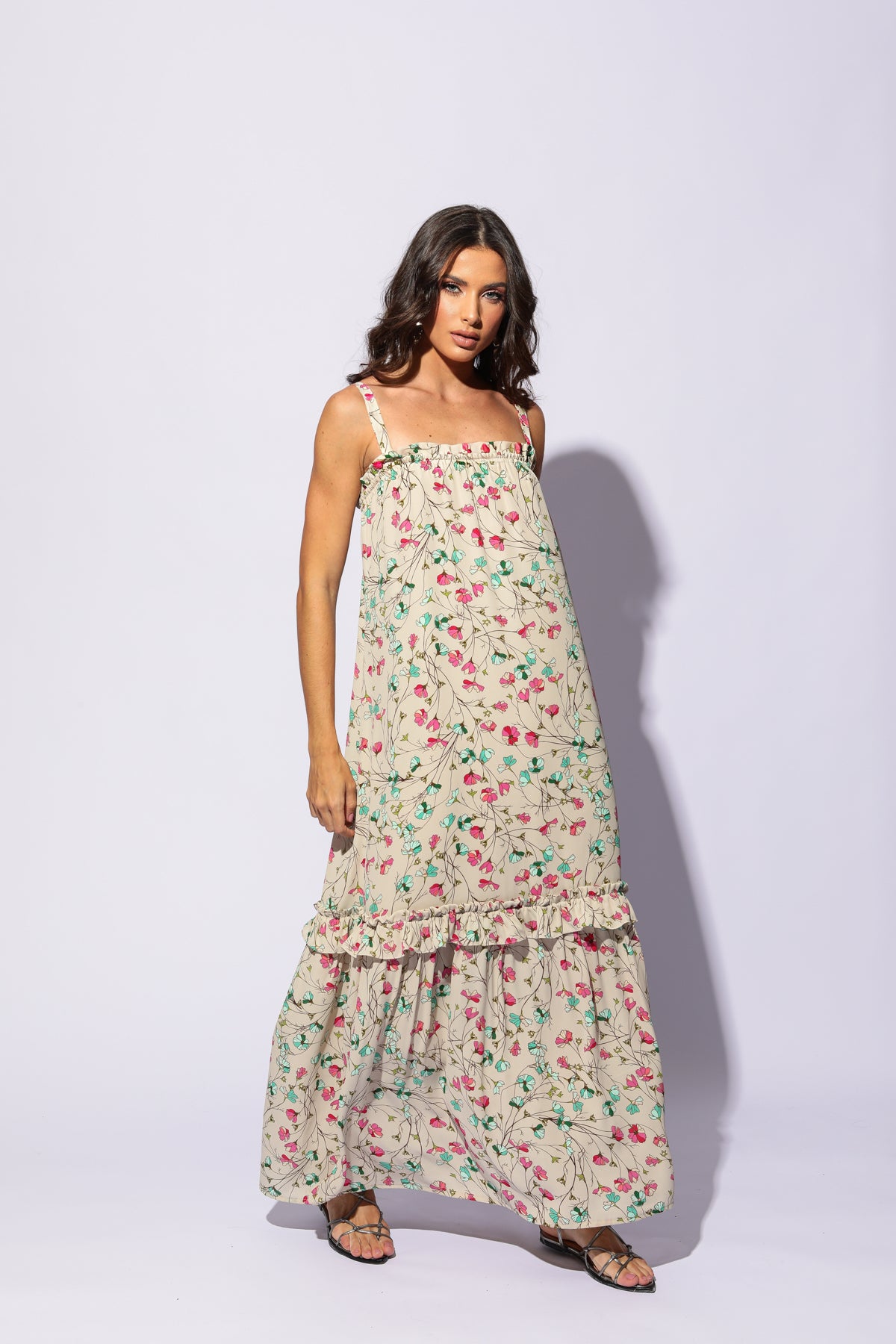 VESTIDO LONGO DE MODELAGEM SOLTINHA. DECOTE QUADRADO COM FRANZIDO E ALÇAS LARGAS. POSSUI SAIA COM BABADO FRANZIDO.